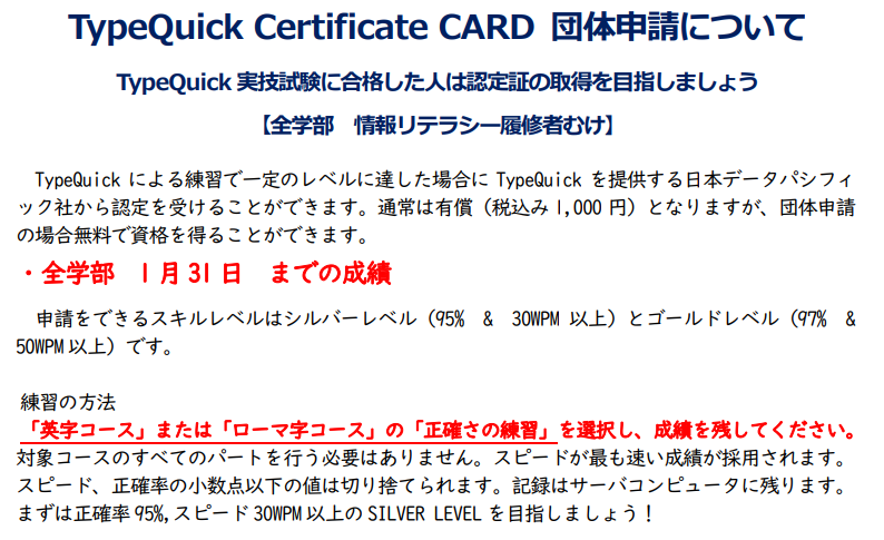Certificate CARDはTypeQuickによる練習で一定のレベルに達した場合にTypeQuickを提供する日本データパシフィック社が認定するものです。通常は有償(税込み1,000円)となりますが、団体申請の場合無料で資格を得ることができます。全学部1月31日までの成績で申請が行われます。申請を行うスキルレベルはシルバーレベル以上です。